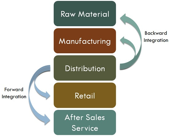 垂直整合(Vertical Integration): 一个产品从原料到成品,最后到消费者手中经过许多阶段。如果一个公司原本负责某一阶段,当公司开始生产过去由其供货商供应的原料,或当公司开始生产过去由其所生产原料制成的产品时,谓垂直整合。