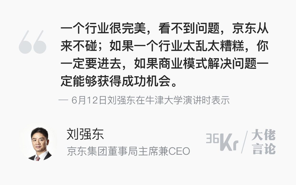 刘强东称,自己做生意的一大原则就是不入局太完美的行业,“如果一个行业很完美,看不到问题,京东是从来不碰的,因为意味着对你来说几乎没有机会,如果一个行业很乱很糟糕,简直可怕,那就是巨大的机会,你一定要进去,如果你的商业模式解决了问题,那么你一定能够获得成功机会。”