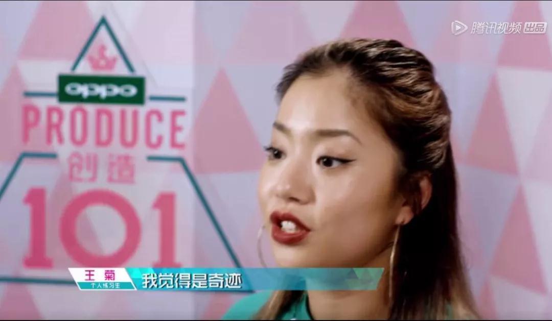 不同于其他女团成员肤白、貌美、大长腿的形象,王菊不瘦、不白,不 “小清新”,出场自带气场,在《创造 101》节目初期被嘲笑为 “大妈”。