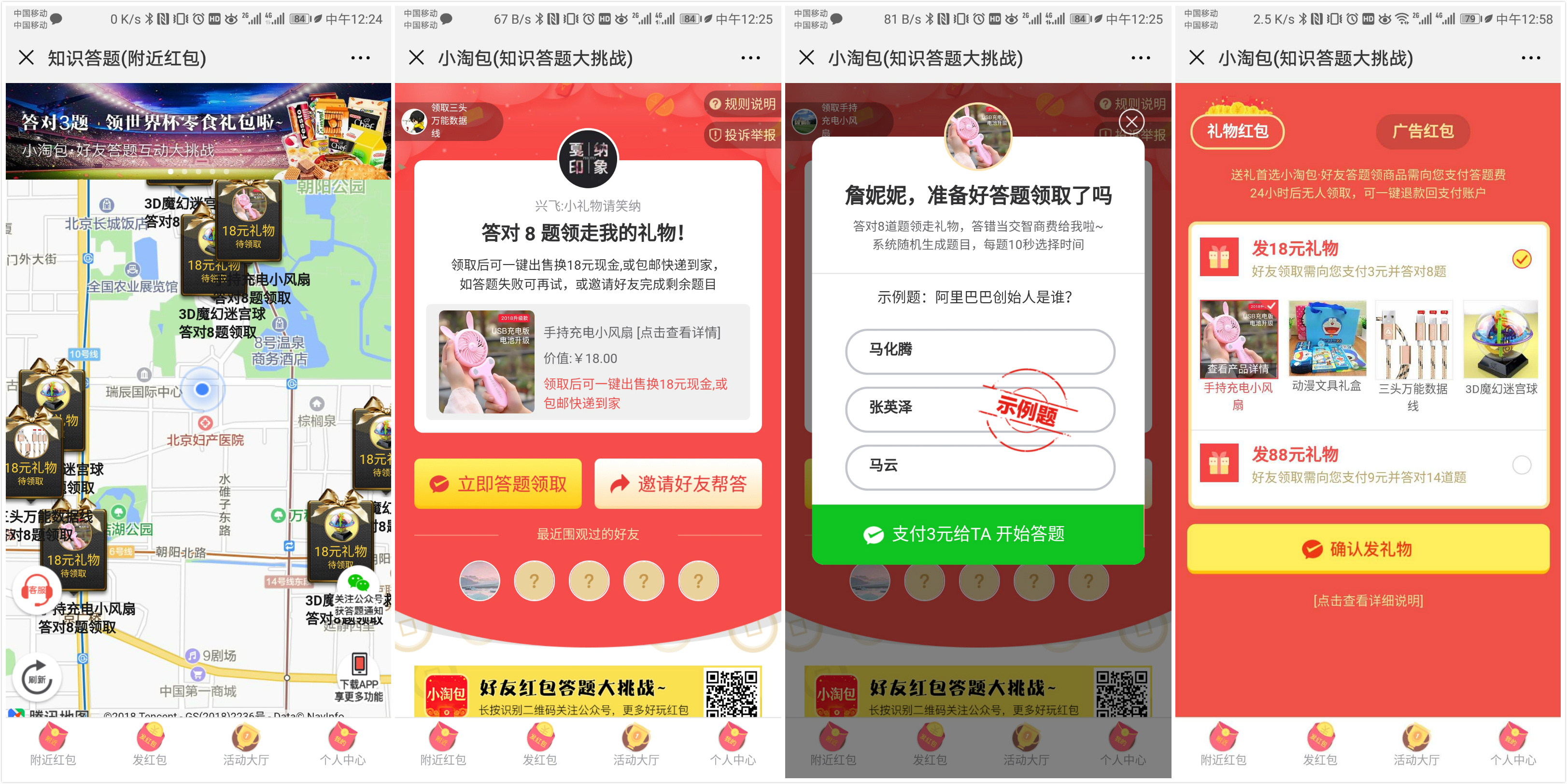 个人用户可以发布好友红包。小淘包目前提供 18 元及 88 元两档礼物,包括小风扇、数据线、充电宝等。用户选择相应礼物并支付,可以仅将答题链接分享给好友,也可以开放允许附近的平台会员答题。答题者需要支付答题费,分别为 3 元和 9 元。答题正确即可通过快递领取礼物或一键提现,答题错误则答题费归出题者。