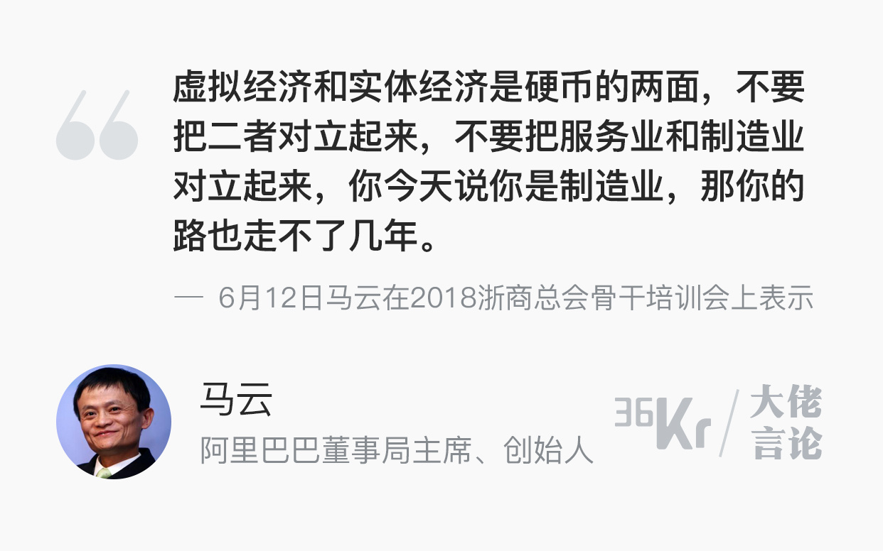 6月12日,马云在2018年浙商总会骨干培训会上发表了演讲,他提到,未来没有纯制造业和纯服务业,虚拟经济和实体经济只是一个货币的两面。