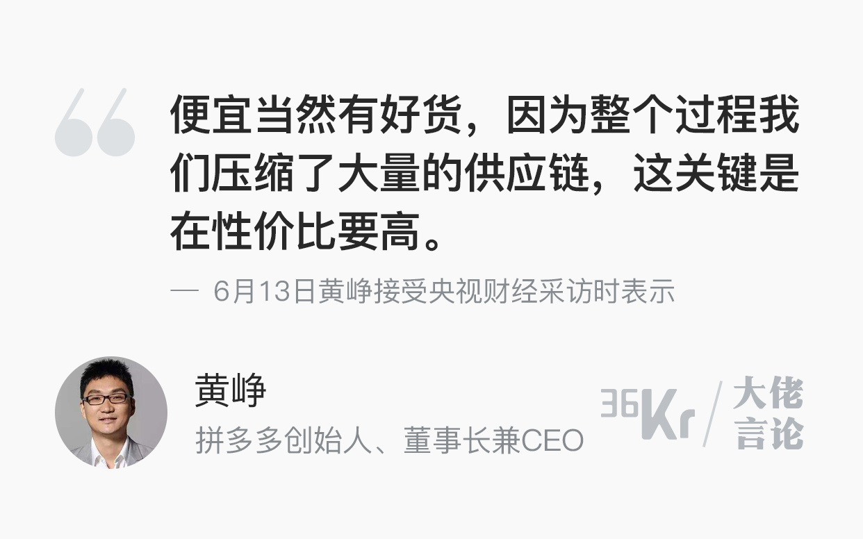6月13日,黄峥在央视财经专访中回应了“便宜没好货”的说法,他表示,“便宜当然有好货,因为整个过程我们压缩了大量的供应链,这关键是性价比要高。”