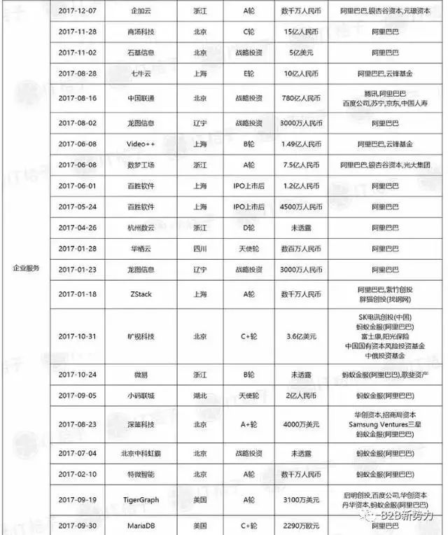 (阿里巴巴2017年投资的20家2B公司,包括2家天使轮公司、6家A轮公司、2家B轮公司、3家C轮公司公司、1家D轮公司、1家E轮公司;4家战略投资,以及1家IPO上市后公司)