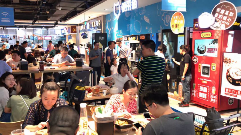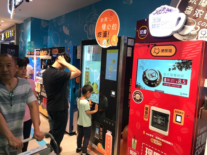 这些是放置在西直门盒马鲜生餐饮区的无人饮料机:一台咖啡机、一台啤酒机、一台橙汁机、一台椰汁机,另外还有两台娃娃机,由同一家新兴的无人零售商经营,配置一名供咨询的服务员。