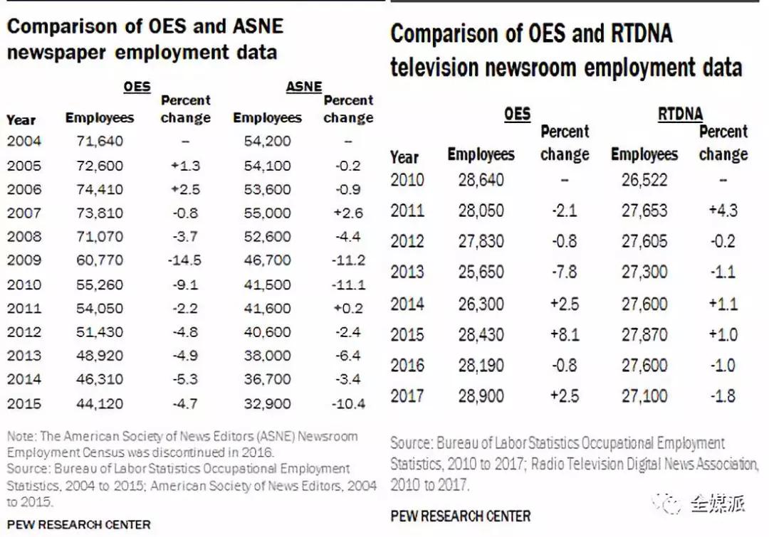 媒体从业人员薪资水平及同比增幅,数据来源:皮尤研究中心