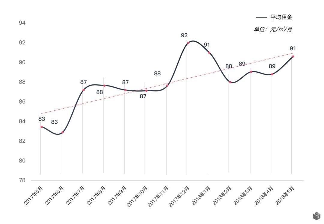 统计显示,近年来北京市住宅平均租金持续上涨。2018年5月,全市普通住宅平均租金已突破90元/㎡/月,同比上涨8.57%。