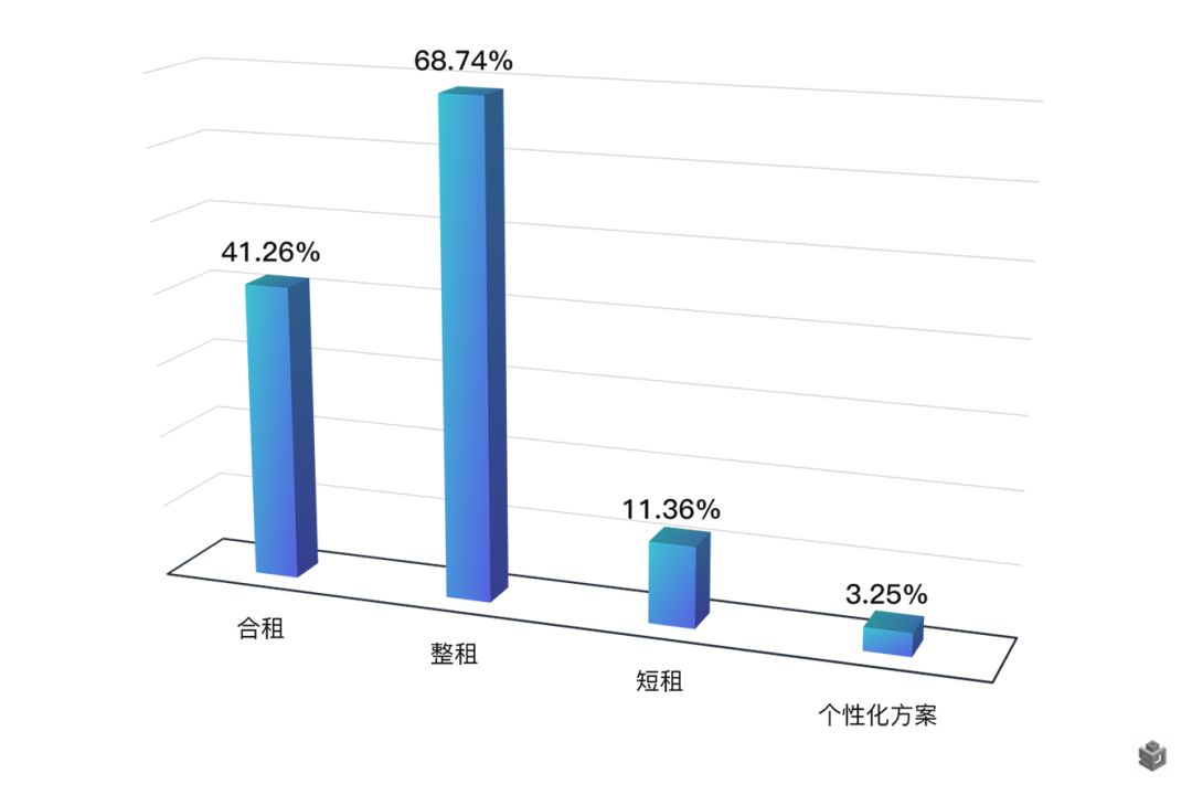 从租住方式来看,关注整租的比例高达68.74%,其次是合租,占比为41.26%。大学生有实习期、试用期等实际需求,11.36%的人选择了短租。靠个性化方案解决的,占比3.25%。关注户型和租住方式的人群占比,基本是对应的。