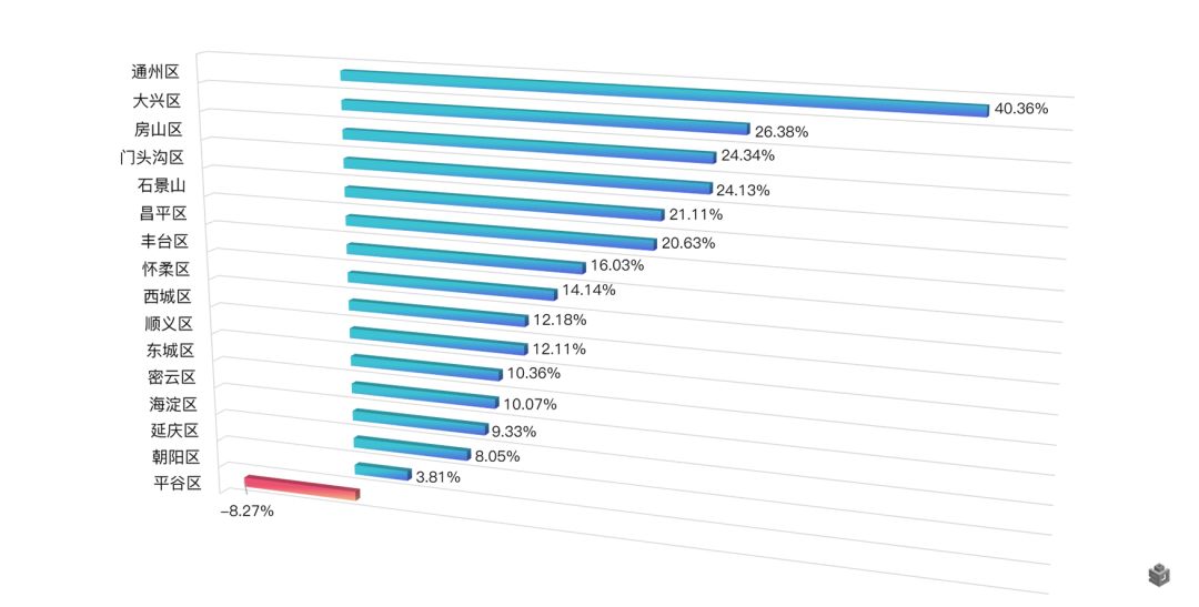 从价格涨跌情况来看,5月租金同比涨幅最大的是通州,上涨40.36%;大兴、门头沟、房山、石景山、昌平,涨幅都达到了20%以上;16个行政区里,仅最远的郊区平谷租金下降,降幅为8.27%。