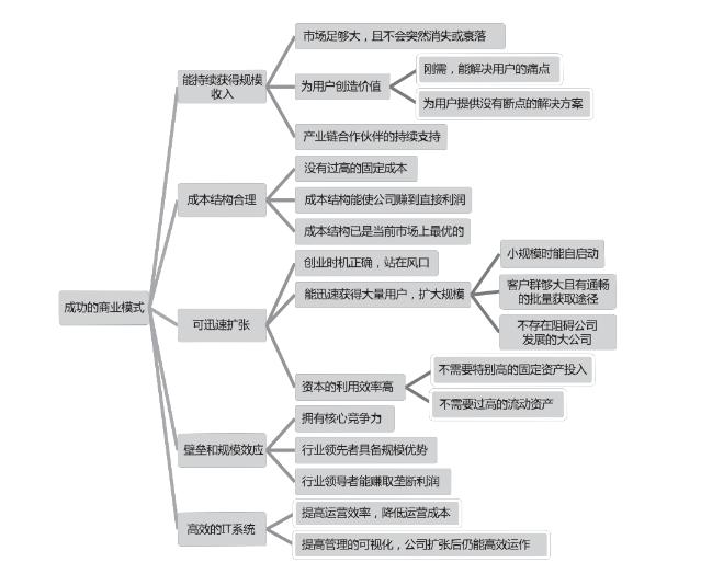 商业模式的可持续性,可以从是否能够可持续获得规模收入、公司产品成本结构是否合理、是否可以可持续性扩张等方面的因素考量。除此之外,还要考虑公司所在行业或者公司本身是否依赖于特定政策、大客户或单一市场。成功的商业模式具有的主要特征如图2-5所示。