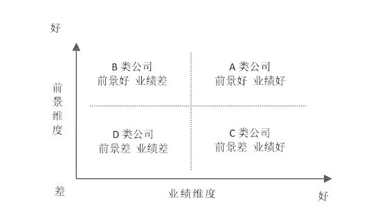 我们也可以将波士顿矩阵进行演化变形,根据“前景”和“业绩”两个维度去评价公司。A类公司为“标杆企业”,是其他同行应该模仿学习的榜样;B类公司为“潜力公司”,是最值得投资的公司;C类公司为“转型公司”,往日的辉煌难以持续;D类公司为“落后公司”,“停、转、关、并”一般都是这类公司的结局。具体如图2-3所示。