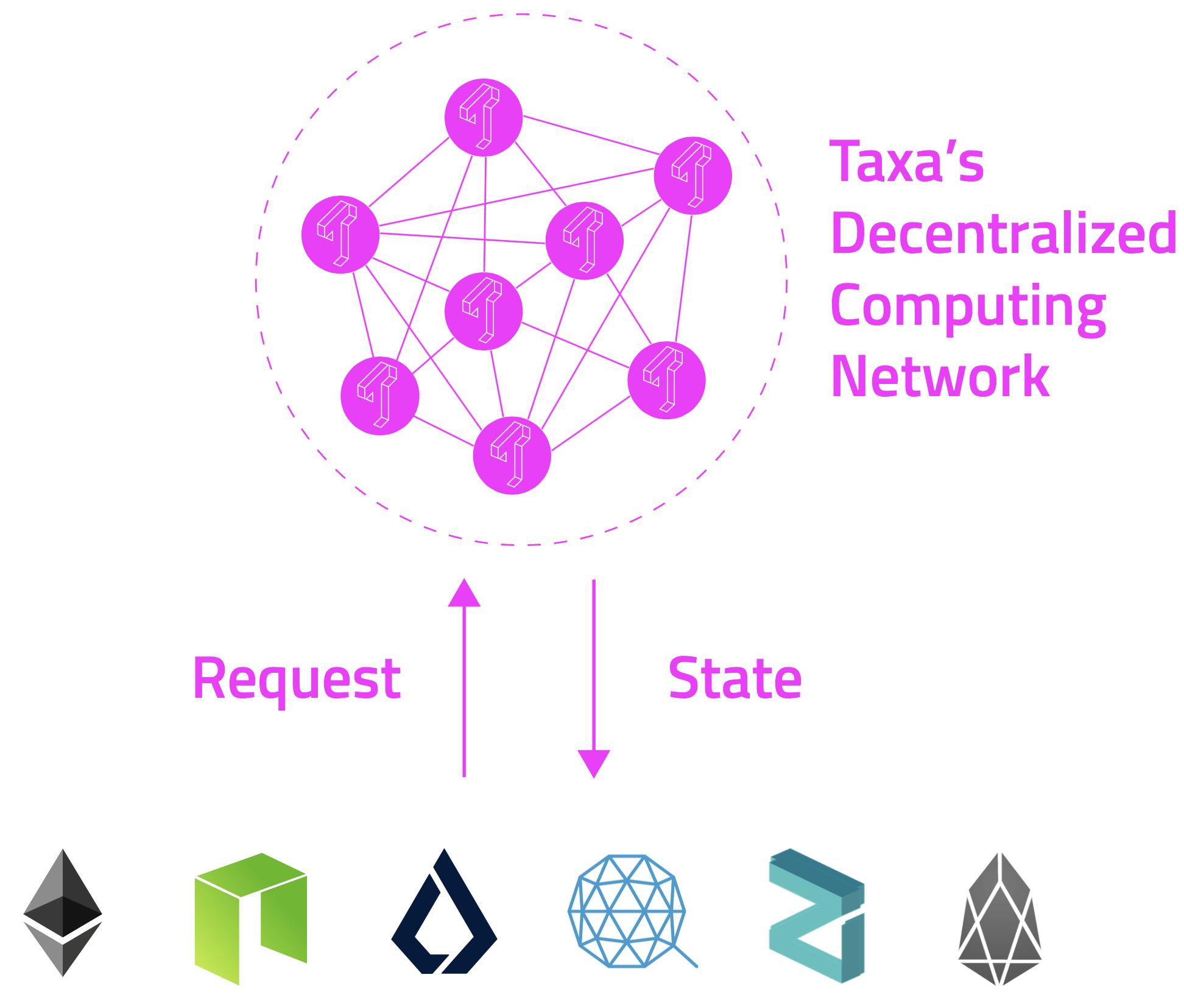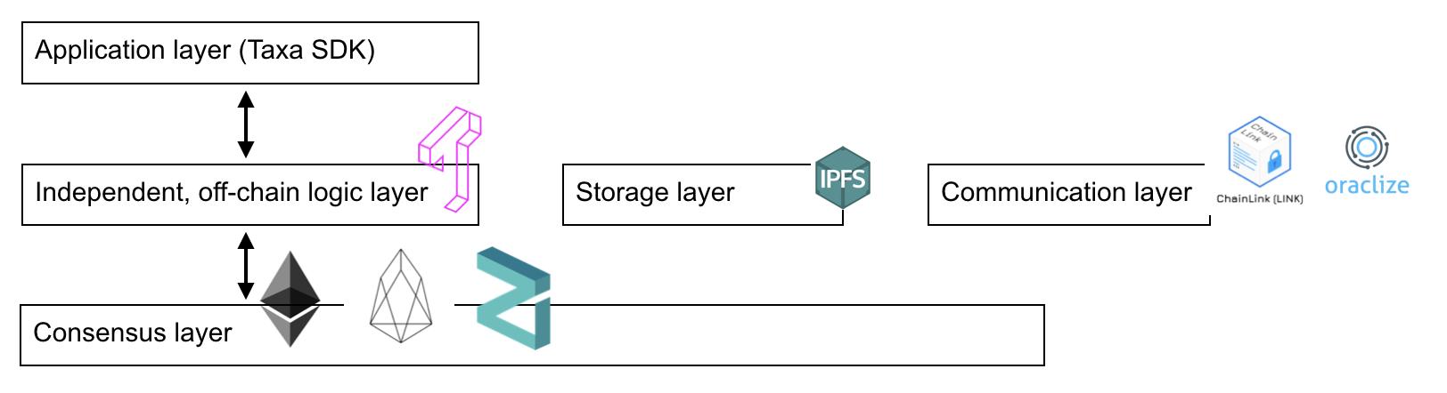 针对这些问题,Taxa给出的解决方案是在各种底层链和DApps之间,建立一个通用的“逻辑层”,将智能合约的执行与公有链的共识机制分离。Taxa作为一个Layer2网络,实现高性能、保护隐私、高度可编程的智能合约。
