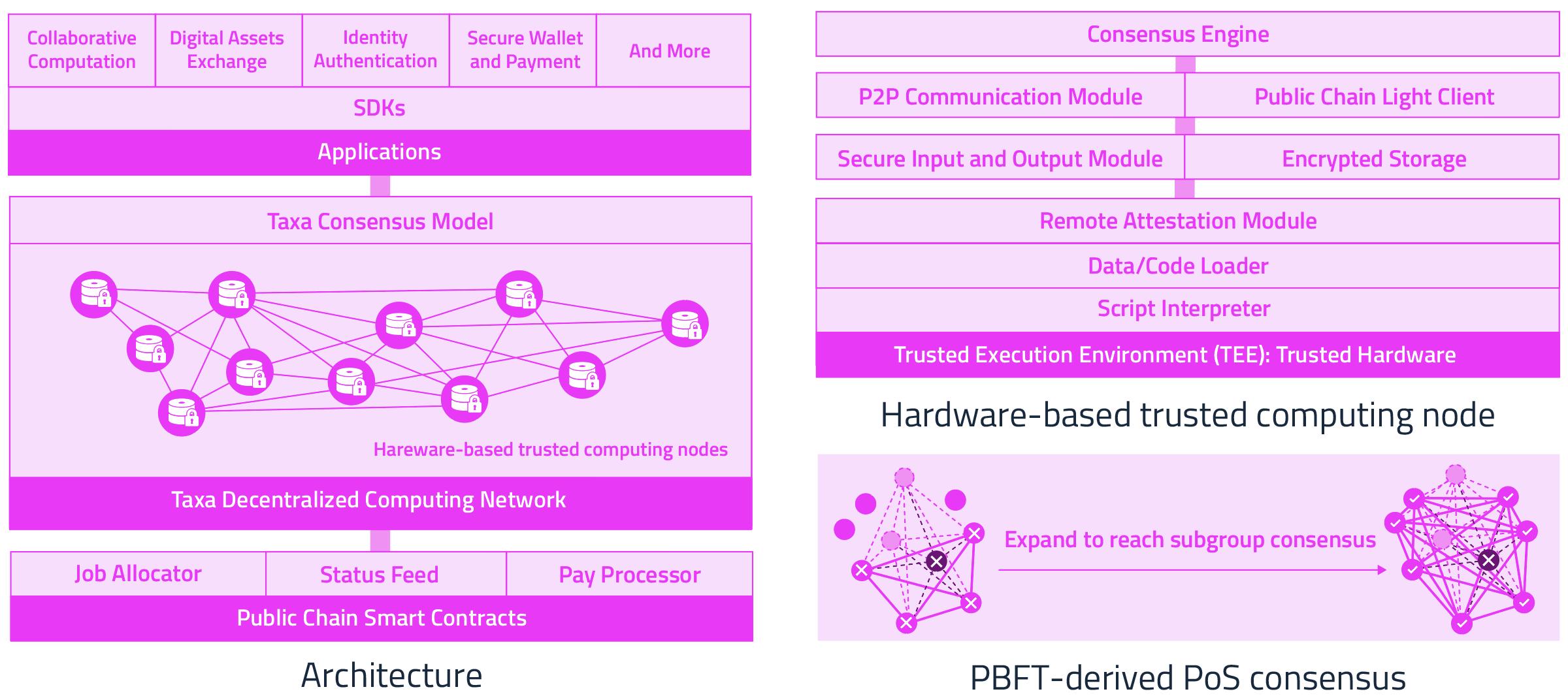 可靠性: Taxa所建立的通用“逻辑层”,以可信硬件为底层硬件,建立了可信执行环境(Trusted Execution Environment,简称TEE)的去中心化网络,并引入PBFT衍生的局部共识算法,保证Taxa链下执行的智能合约的高性能、隐私性、可靠性且可验证。
