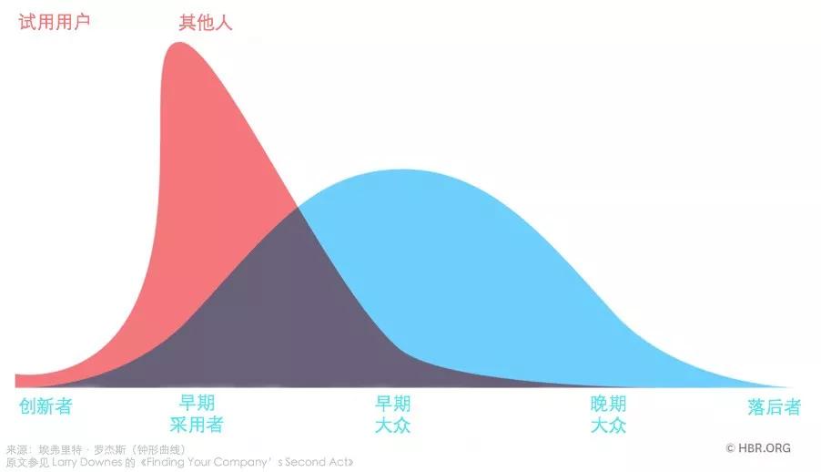 罗杰斯原有的五个细分受众,在这里被缩减为两个:试用用户(即最初帮助开发该产品的那群人)以及其他人。爆炸性产品以及为了推广这个产品所建立的业务,都会迅速崛起,但也会几乎一样快的速度消失殆尽。