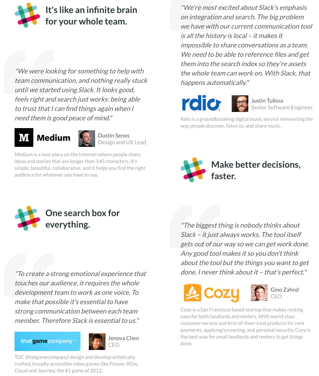 Slack的工作方式、观感和使用感觉等一切,都背离了企业通讯工具传统的做法。不同于传统工具所青睐的暗淡灰色和蓝色,Slack的界面生动活泼。用户不仅仅只能用文本的回复,Slack对表情符号的支持非常受欢迎。Slack的商标,格子标签图标,反映了工具的社交敏感性,并成为了一个强大的门户通向Slack其余的产品。Slack的口号“少忙点”,也完美抓住了品牌的精髓。