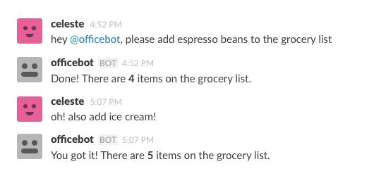 在2014年发布正式版不久之后,Slack就尝试了机器人。巴特菲尔德发现自己需要一种记笔记的方式,以备日后审阅,于是开始编写一个程序,将自己的笔记作为信息发送到只有巴特菲尔德才能访问的私人频道。这个程序成了Slack bot,它是Slack最流行和最常用的功能之一。巴特菲尔德后来说,关于Slackbot的想法来自Glitch中一个友好、乐于助人的NPC,它会为玩家提供如何推进任务的信息,并为他们提供一些关于Glitch中游戏的技巧。