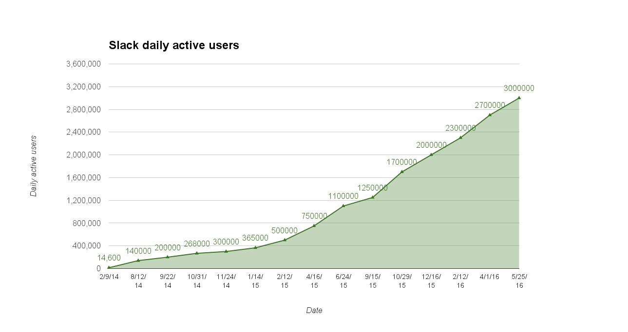 Slack似乎势不可挡,在E轮和F轮融资之间,它的用户增加了3.5倍。截至2016年4月,Slack每天有270万活跃用户、80万付费用户和430名员工。越来越多的团队和公司开始使用Slack,包括全球商业情报出版商Dow Jones、联邦航空管理局和美国国务院。在2016年底,Slack推出了另一个新功能,视频聊天。
