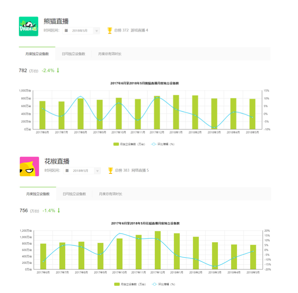 陌陌是否是个例?再来看一下花椒和熊猫直播。2018年一月份至五月份,花椒月度独立设备数分别为1115万、1007万、836万、767万、756万;熊猫直播分别为882万、872万、793万、801万、782万。很明显,这二者所面临的问题已经不是用户增长放缓,而是用户逐渐流失。