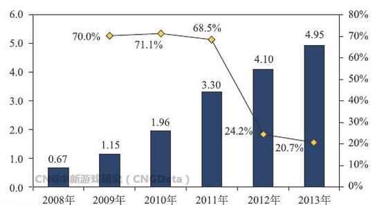 这一状况即使在玩家数量迅速增长的近十年时间里,也得以延续。游戏工委、CNG中新游戏研究联合发布的《2013年中国游戏产业报告》中,2008年中国游戏市场用户数量为6700万,2009年终于突破一亿,在这段时间我们可以看到,虽然游戏用户增速迅猛,但通常以百万、最高一千万左右为基数扩增。与之相比,从2010年以后,每一年游戏用户增长的数量基本在一亿级别。