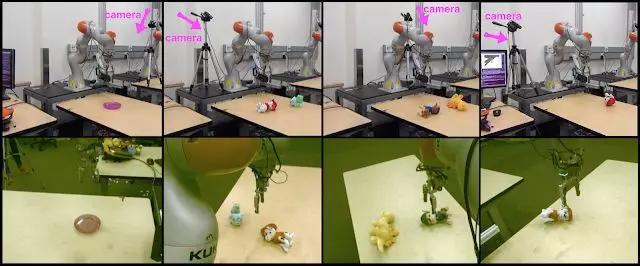 用物理机械臂实现视觉指示目标的视点不变操作。新方法学习了一种单一策略,通过从截然不同的摄像机视点捕获的感官输入来到达不同的目标。第一行显示了视觉指示的目标。