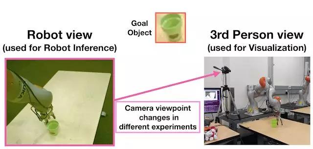 为了解决以上问题,研究人员设计了一种新的操纵任务,给一个七自由度机械臂提供一个物体的图像,并命令它在一系列干扰物中拿到特定的目标物体,同时每一次尝试的视点会发生剧烈变化。采用这种做法,研究人员能够模拟复杂行为的学习以及向未知环境的迁移。