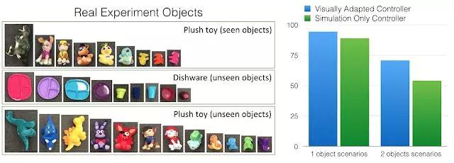 在视觉特征和少量真实图像进行适应之后,模型性能提高了 10% 以上。其中所有用到的真实物体都与模拟中看到的截然不同。