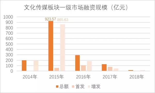 数据来源:东方财富。上市公司增发募资潮曾经蔚为大观,仅2015年文化传媒板块的增发募资就达到865.63亿元。2017年至今,上市公司一级市场融资规模大缩水。近几年增发融资规模远远超过IPO融资。
