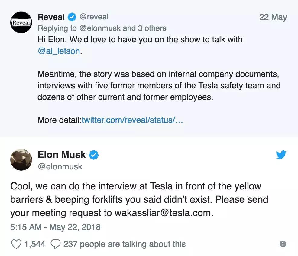 实在受不了 Reveal 的无数次骚扰,马斯克在推特上讽刺地回应道: