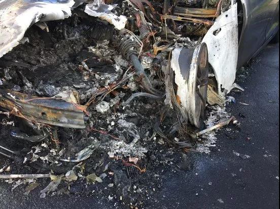 下图是一辆前部基本被烧成架子的特斯拉,电池包依然没有着火(因为电池包安装在更往后的地方,乘员舱脚下)。