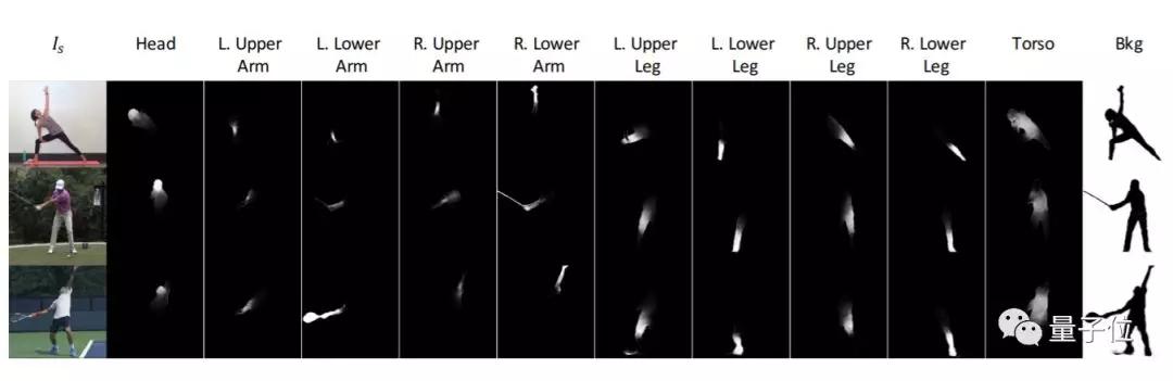运动时身体每个部分轨迹不同通常会分段仿射运动场出现,通过将原图Is分割成前景层和背景层,并将前景的身体部位分割成头、上臂、下臂、大腿、小腿和躯干等部分,基于UNet-style架构将原图分割。