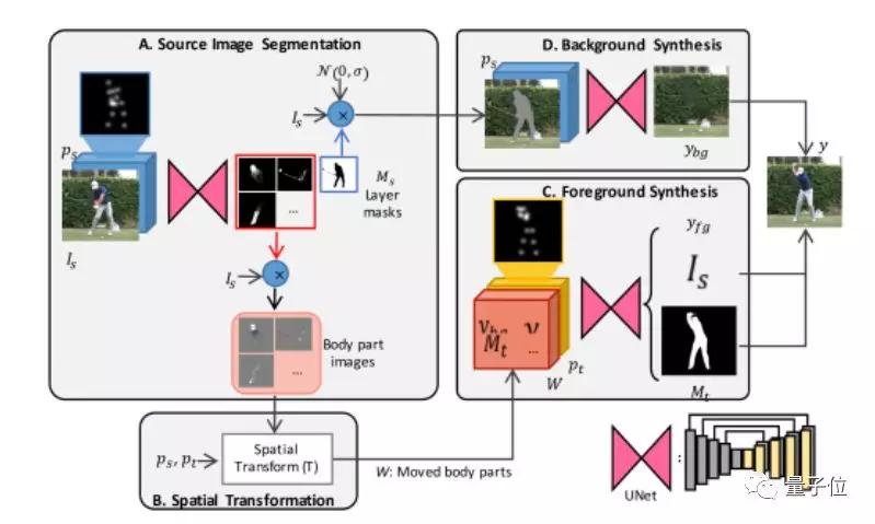 将源图像和它对应的2D姿势信息,以及目标姿势输入到这个模型中,它就能合成出一张输出图像,把源图像上的人物形象和目标姿势结合在一起。