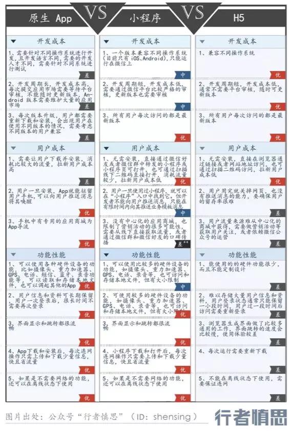 讲小程序,我反复在纠结是否应该认为这是个操作系统。在此之前,我先把原生 App、小程序、H5 之间的优劣差别列出来。小程序实际上是介于原生 App 和 H5 的中间解决方案。