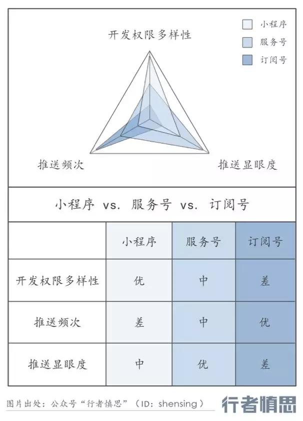 小程序、服务号、订阅号三者形成了矩阵。订阅号的推送功能最强,但小程序获得了开发权限的多样性。由微信定义的 “App”,可能就是若干个订阅号,一个服务号,一个小程序,基本就能满足创业者的需要。小程序左手赋能商家、右手提升用户体验,希望取得一个平衡。小程序的成功,可以让中国的大部分线下商业实现线上化。