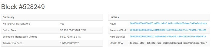 上面这一长串序列是一个“区块哈希(block hash)”,它是一串加密数字,当这串数字生成,意味着新交易已经经过了验证,并写入到比特币区块链上。上周,比特币诞生了一个新区块——区块号为528249,区块奖励为12.5比特币,约合8万美元。