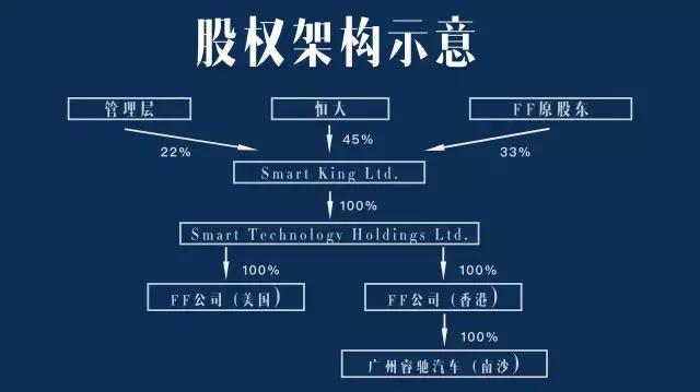 之后,时颖公司把全部股权转让了给恒大健康。截至2017年12月融资后,FF的估值达到44.5亿美元,恒大健康将持有其 45%的股权,贾跃亭持有33%股权,余下22%股权归属于公司管理层。