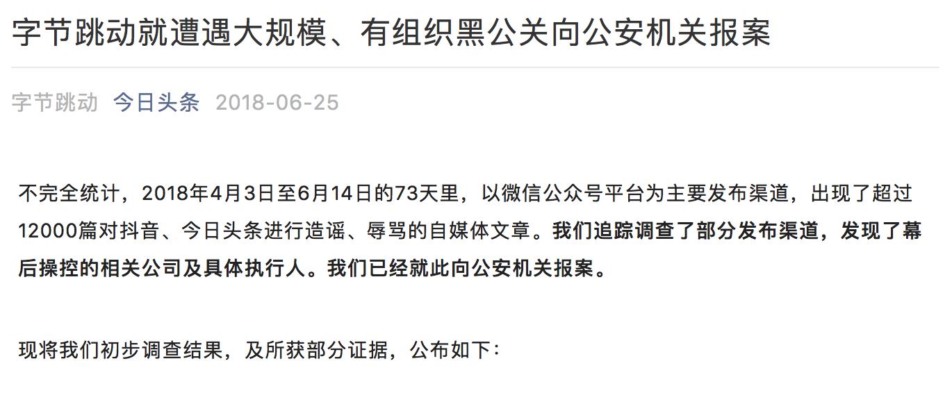 紧接着,今日头条就在官方推送中,公布了今日头条就造谣、黑公关事件搜集的相关证据,将矛头直指微信公众号平台。