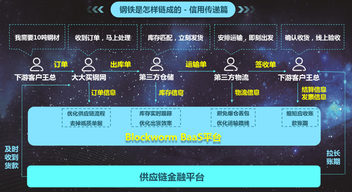 “信息上链的基础上会形成数字资产,再往下的想象空间就非常大。比如目前的电子票据和纸质票据,能触达的经销商和供应商只能在核心企业的一级或者二级之间做流通,没有办法往中小供应链做流通,中小供应商也没有能力管理这些票据。如果在核心企业形成数字化资产,上下游在上面完成交易,形成数字化的可信资产,这些资产的融资就像票据一样,可以打穿一二三四级,可以一直延展下去,比如在核心企业这个层面是一个1000万的应收,通过数字资产到最终小企业的时候可能就变成了5万块钱、10万块钱的应收,实际上是和核心企业直接挂钩,传统票据是做不到的。”