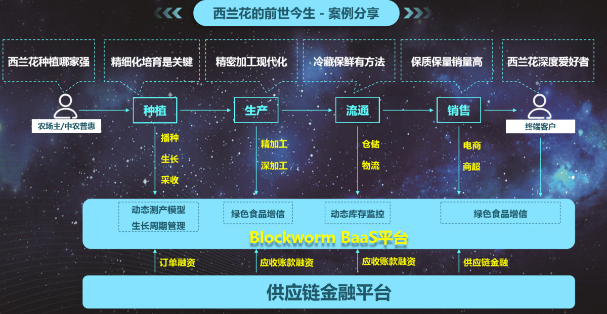比如,在与中农普惠的合作中,翼启云服BaaS通过区块链记录西兰花的生长过程数据之后,可以给终端提供的应用,包括生命周期的溯源,判断西兰花到底新不新鲜;可以借助一定模型可以动态预算产量,调整种植策略、降低成本;还可以提供供应链库存管理;基于上述信息,资金方可以评估风险,基于库存等提供订单融资,比如化肥采购、农药采购。