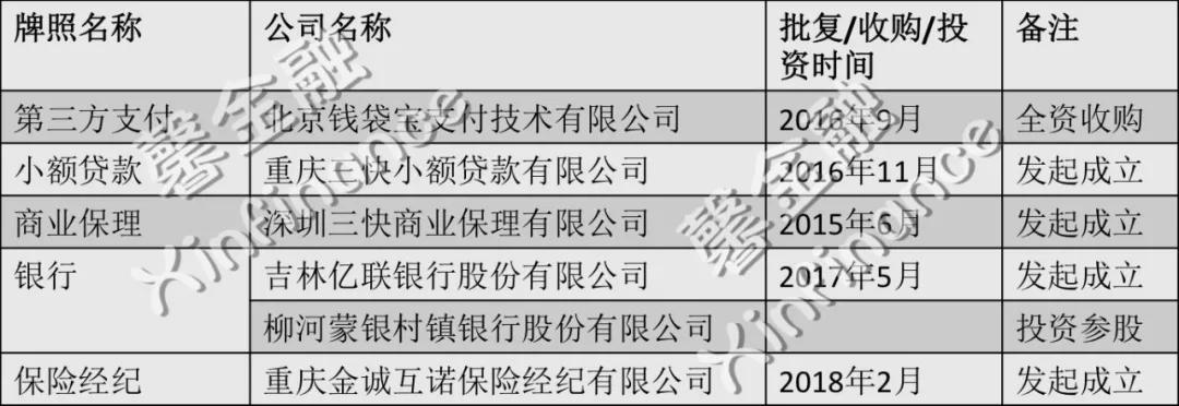 包括2017年8月9日成立的北京美团金融科技有限公司, 2016年11月取得牌照的重庆三快小额贷款公司,2016年9月全资收购的第三方支付公司钱袋宝。以及,在美团平台上为中小商家提供的无抵押小额贷款(美团小贷)。