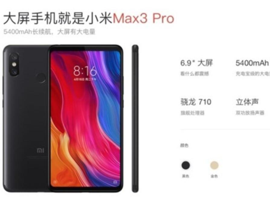 前不久工信部曝光了一款超大屏小米新机,当时有消息称这是小米Max 3,现在网络上又出现了一张小米Max 3 Pro的宣传页面,一起来看下。图片显示,小米Max 3 Pro搭载高通骁龙710处理器,内置双功放扬声器,支持立体声,后置双摄像头的感光元件是IMX363,与小米8和小米MIX 2S同款,其他方面与工信部曝光的小米Max 3一样。