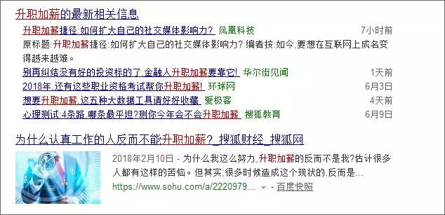再者,在百度搜索框搜索关键词“升职加薪”的时候,并没有出现招聘网站相关内容,这说明用户的在有“升职,加薪”需求的时候,是不会第一时间想到招聘网站的。