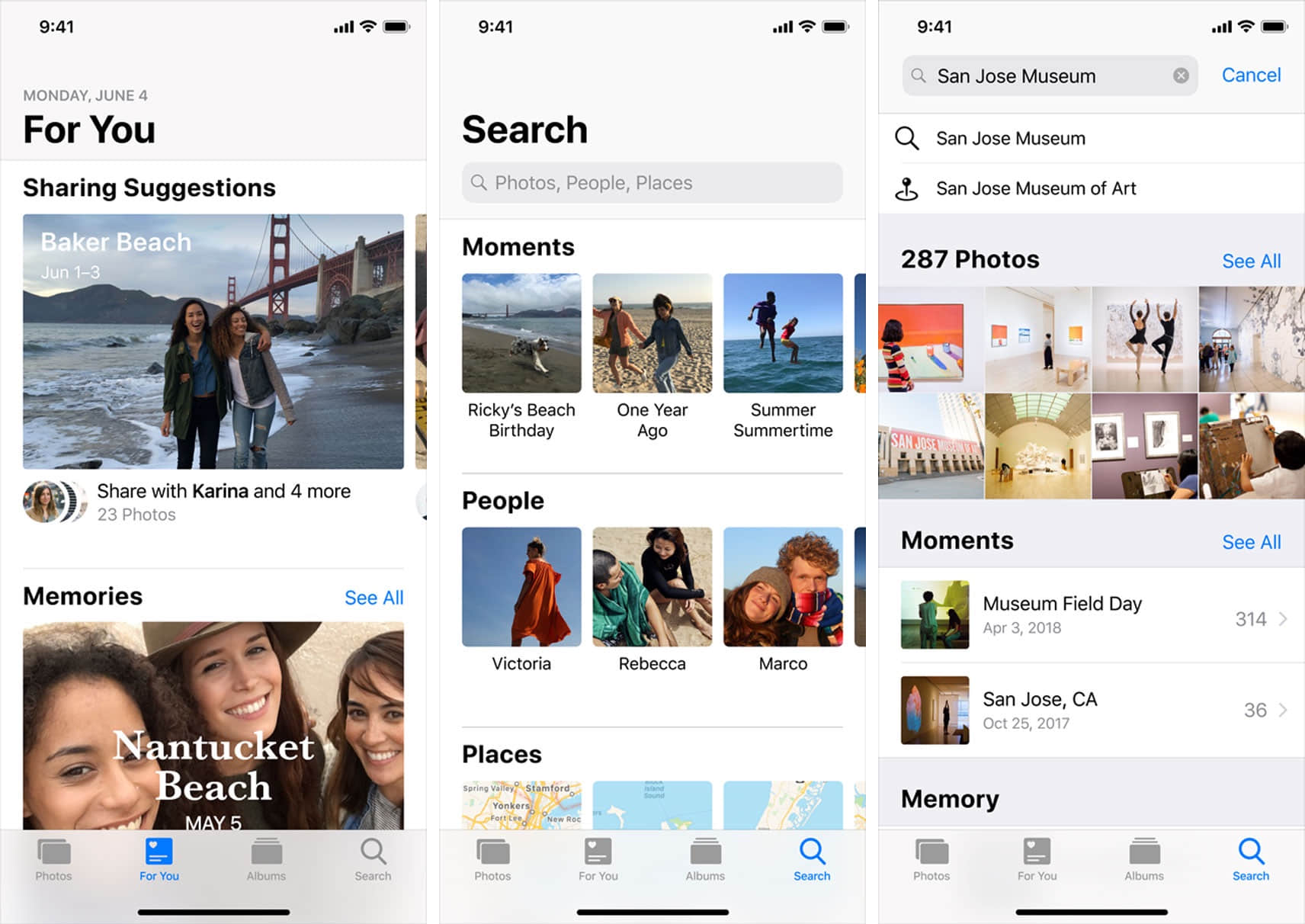 iOS 12 的照片结合了最新的机器学习技术,可通过地点、人物、时间等条件来提供智能的搜索建议,还增加了「为你推荐」功能,向用户推荐值得分享的照片,并提供照片后期处理建议。
