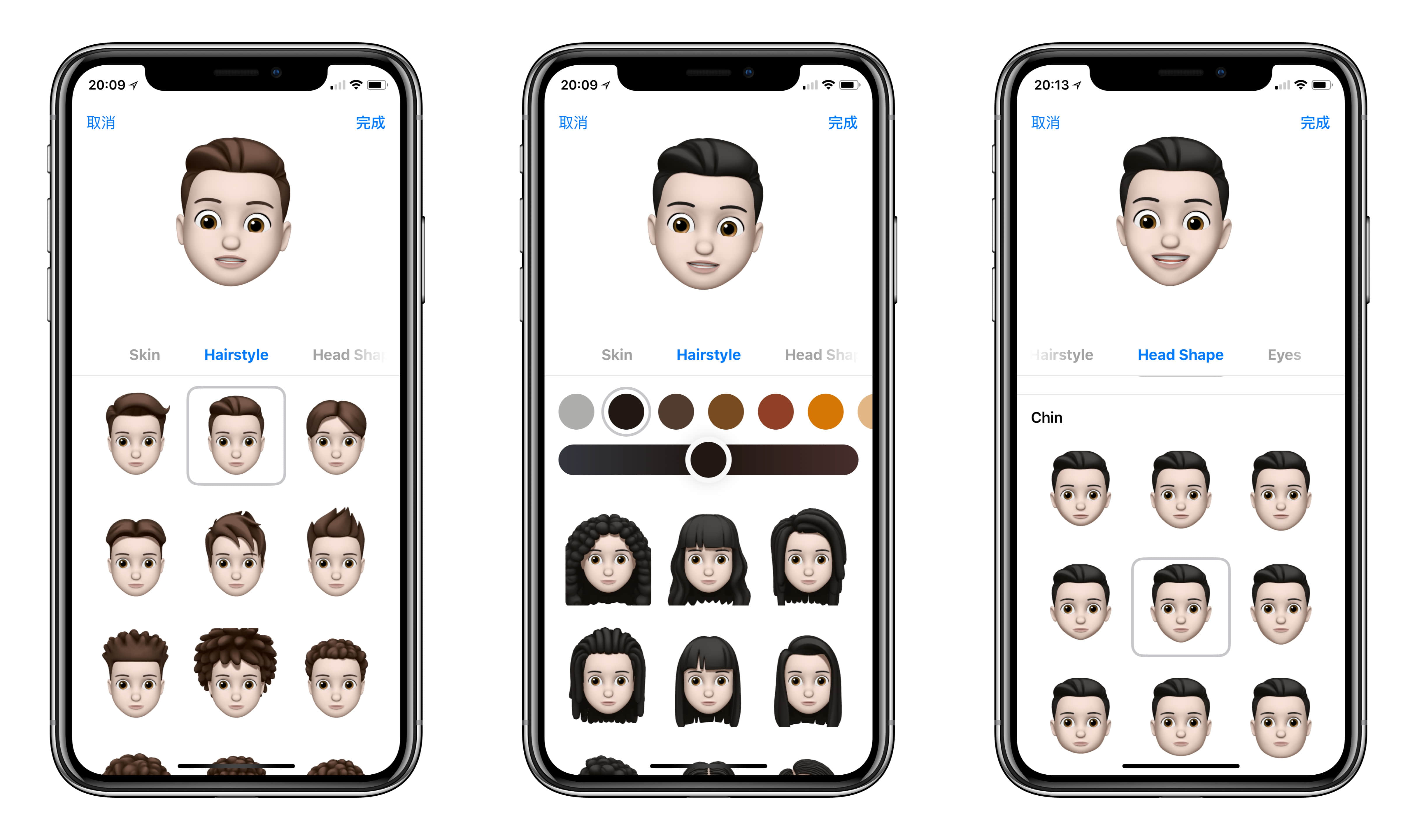 除此之外,Animoji 也带来了它的兄弟 Memoji。Memoji 是根据用户自身的形象来定制的 Animoji 内容,可以以自己的脸部为基础来制作一款属于你自己的 Animoji。在 Memoji 的设置属性中,不仅可以修改皮肤、发型,甚至还能修改眼部的色彩和眼镜等,你也可以把当做一款「捏人儿的游戏」。