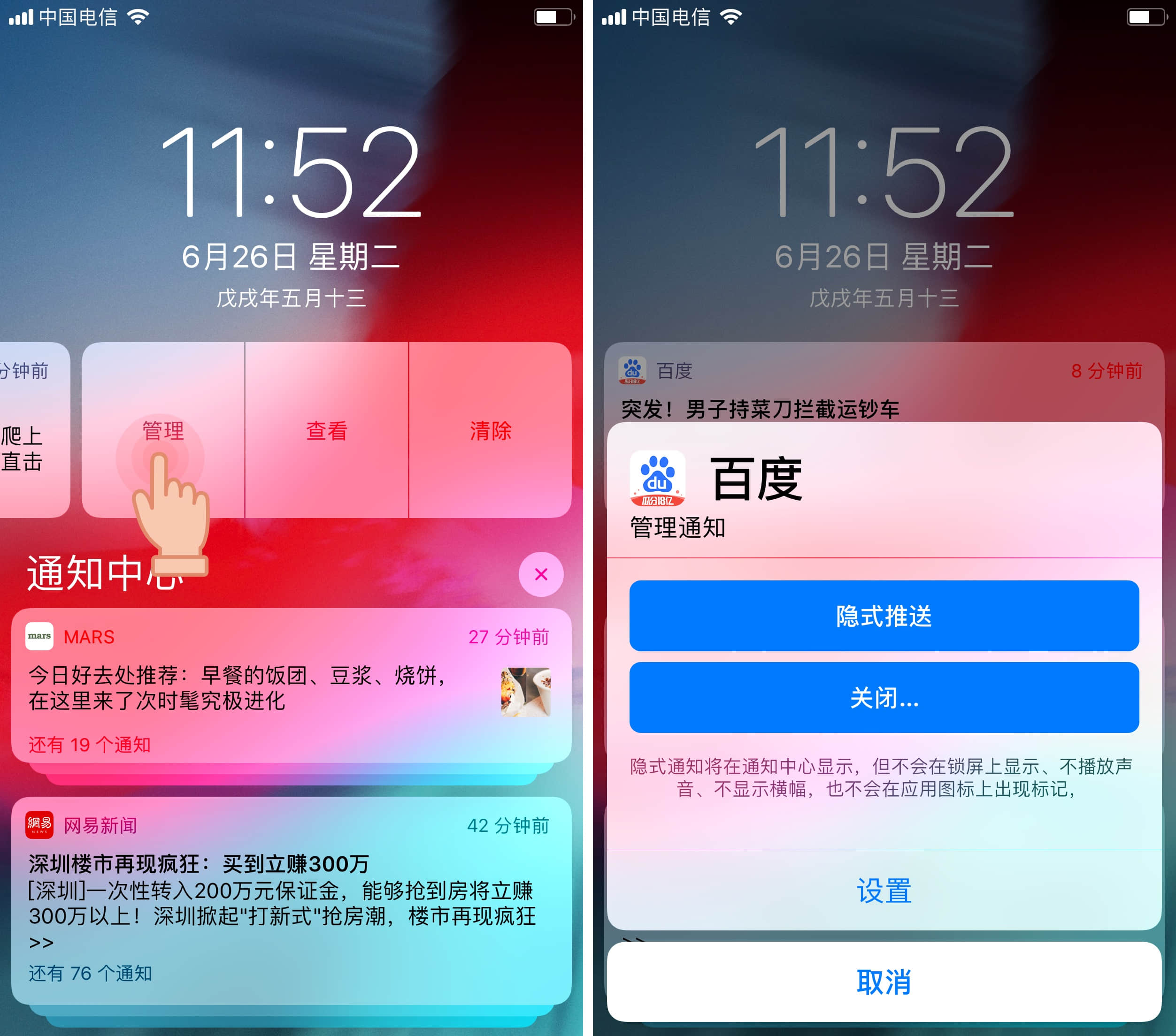 此外,你还可以直接在锁屏界面管理 App 的通知方式。