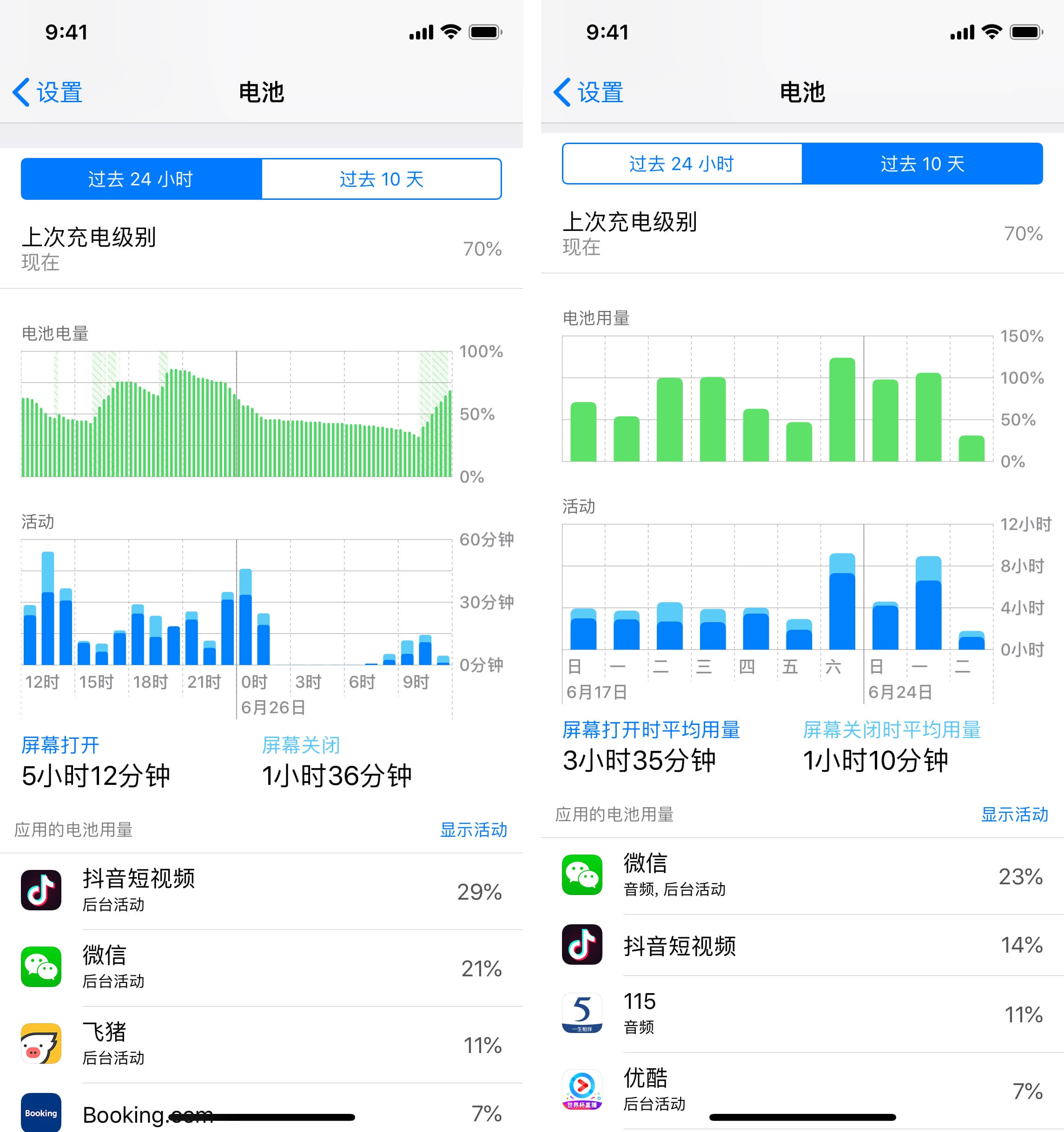 iOS 12 中提供了更详细的电池用量信息,从原先的「过去 24 小时」和「过去 7 天」变为「过去 24 小时」和「过去 10 天」,还增加了柱状图用来显示设备的电池用量和使用时间。此外,在「过去 24 小时」中还新增了前台用量和息屏用量,在「过去 10 天」中增加了平均亮屏用量和平均息屏用量。