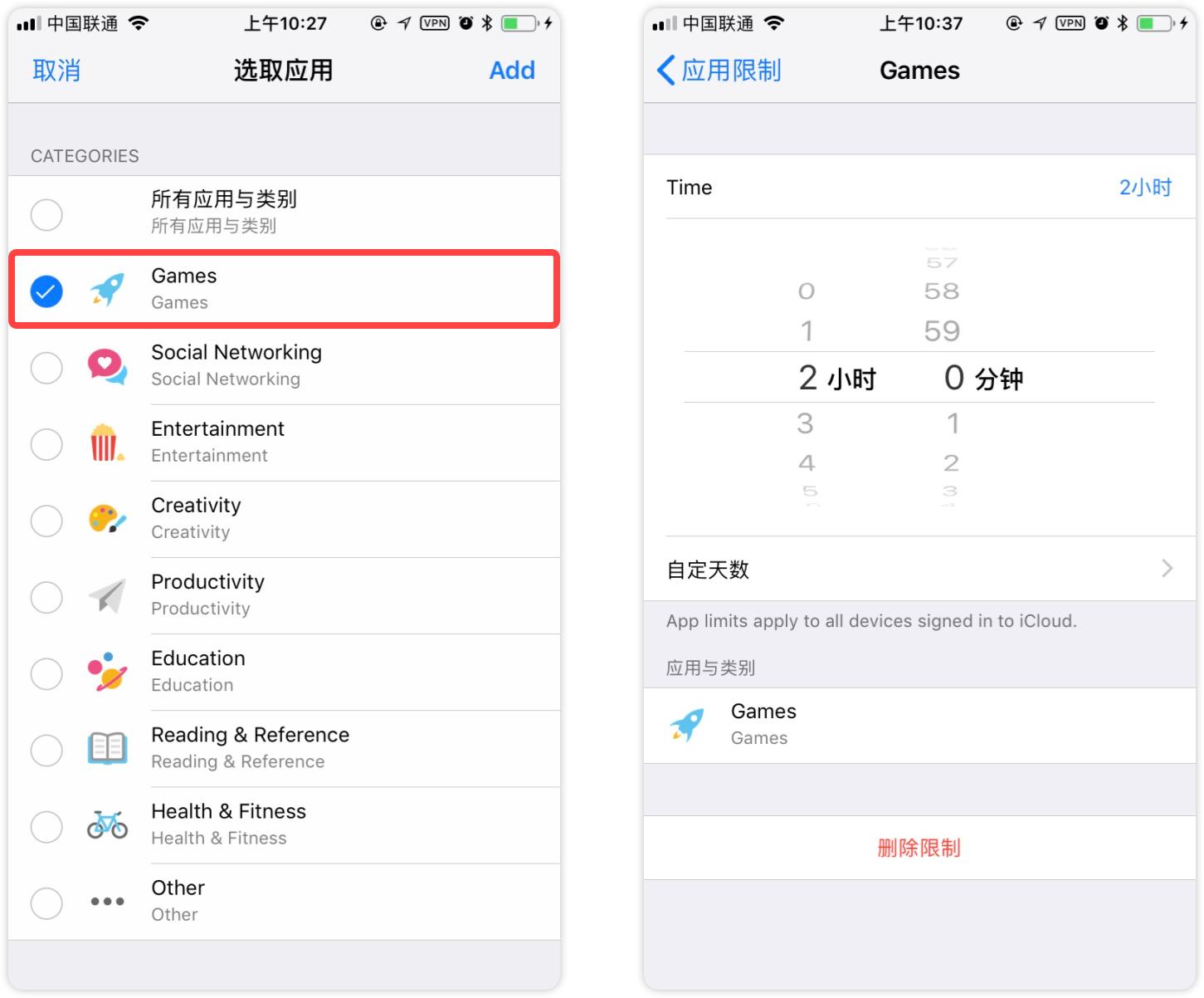 而且作为 App 使用量的采集,苹果却拿它来做了更多事情。每周的数据,iOS 都会给你推送,让你知道本周 App 的使用情况、时长以及频率。并且可以自行对应用的使用时间进行设定,比如我可以选择「屏幕使用时间 - 应用限制 - Add - Game」设置时长为 2 小时即可。如果你对每天的使用量有更详细的设置,也可以进入自定义天数进行设定。