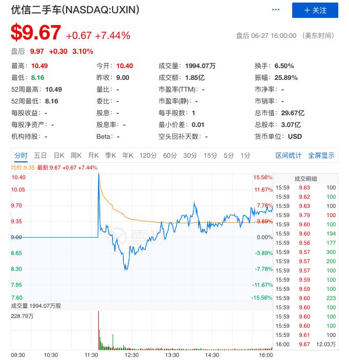 顶着2.6亿美元亏损,二手车电商优信(股票代码:UXIN)于美东时间6月27日上午在纳斯达克挂牌上市。股票发行价9美元,当前市值约29.67亿美元。