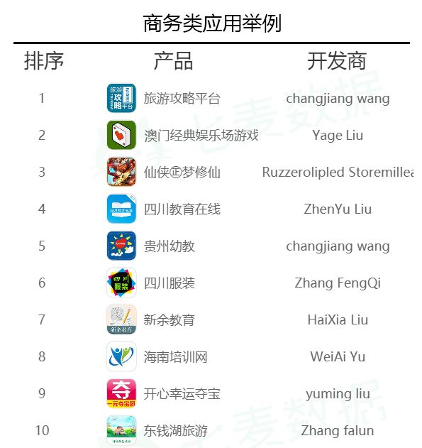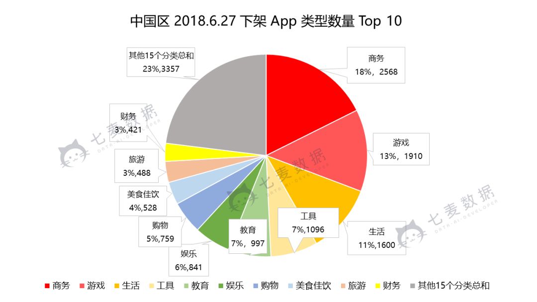 本次下架名单中,下架的商务类 App 数量远超于作为以往下架最多的游戏类 App ,其下架量占下架总量的 18% ;游戏类 App 下架量占总量的 13% 。此次针对商务类 App 清理时主要针对产品功能与选择类别不匹配的 App 居多,例如:母婴、游戏、竞彩、旅游等 App 均出现在商务分类中。