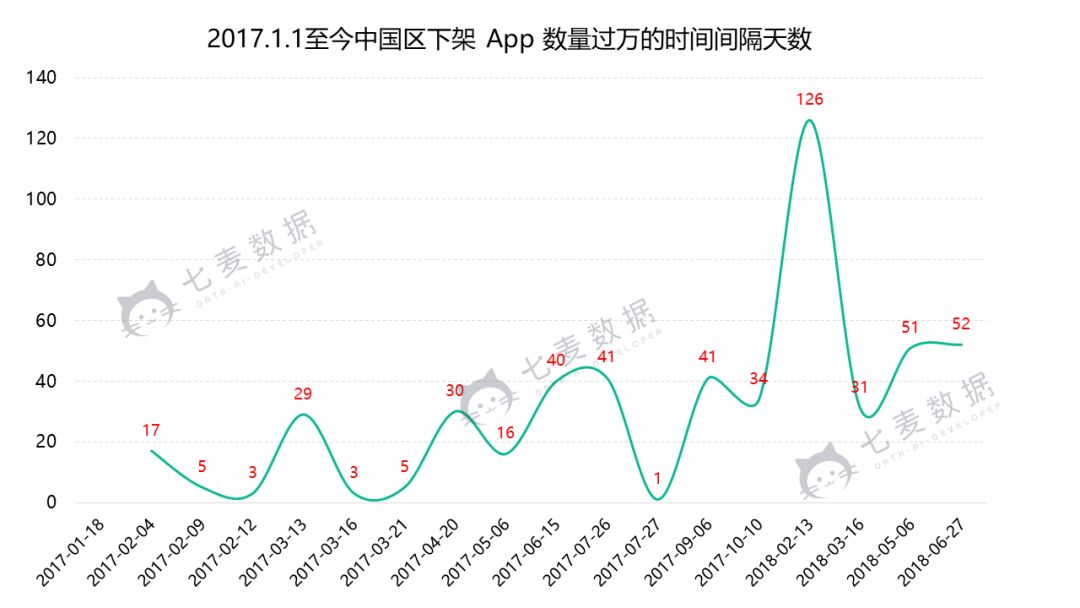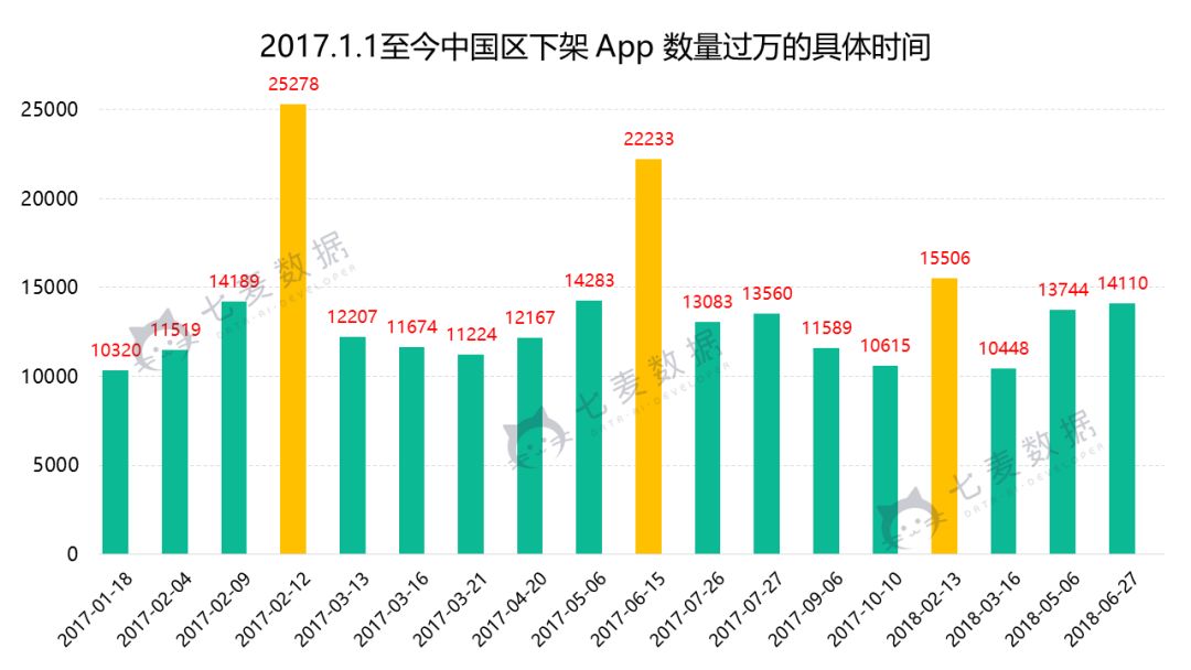 苹果这种清理行为在 5 月 6 日的时候同样也发生过(1.4 万款 App 集中下架,同一开发商下架 372 款,苹果再次引发下架风波!),详针对这个问题,七麦研究院整合从 2017 年 1 月 1 日开始至今中国区下架 App 数量过万的时间汇总。