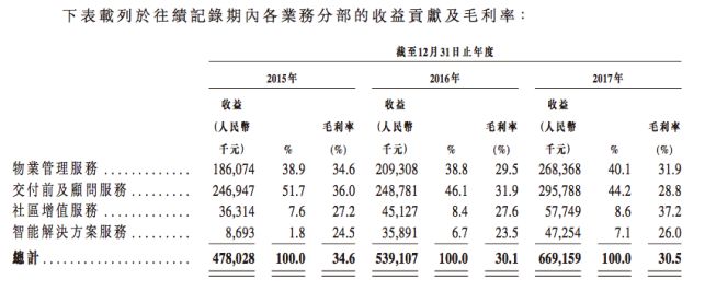 佳兆业于港交所披露的材料显示,佳兆业物业共有物业管理服务、交付前及顾问服务、社区增值服务、智能解决方案四大业务线。截止2017年12月31日,该公司年度收益为约6.69亿元,上述四大业务板块的营收贡献占比分别为40.1%、44.2%、8.6%、7.1%,在管物业建筑面积2400.8万平方米。