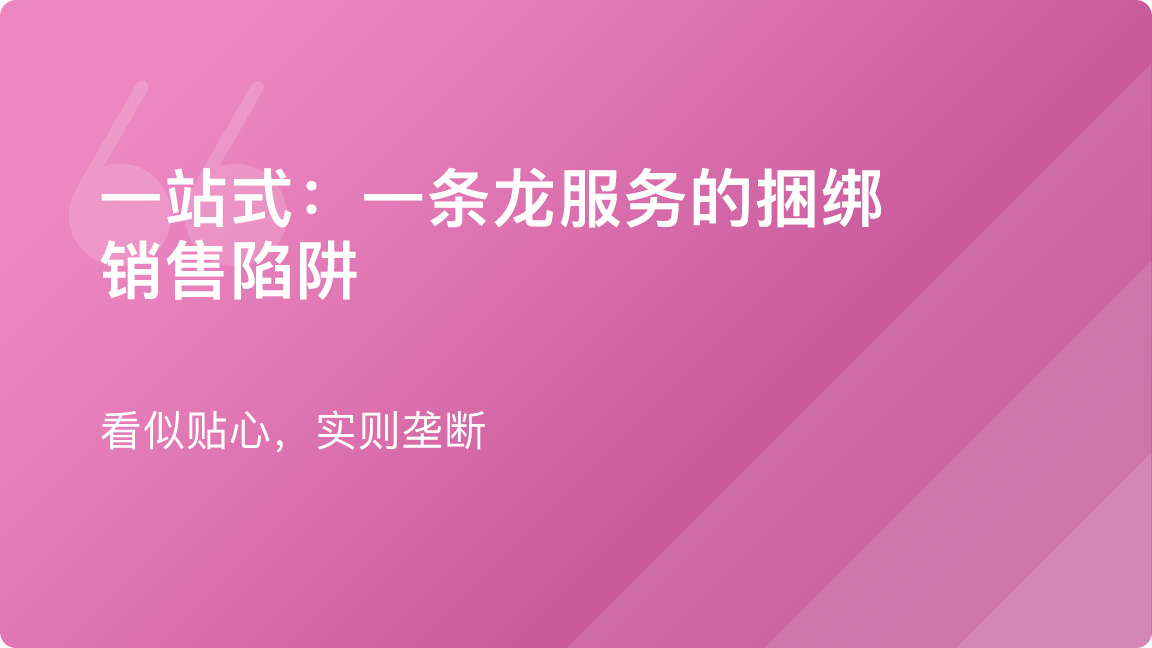 一站式智能家居解决方案意思是只买一样和其他品牌不兼容,可能得他家买下整个操作系统;一站式旅游就是平台会过于贴心主动帮你购买保险;一站式购物,去趟宜家总觉得不能白来,买了一堆没用的。